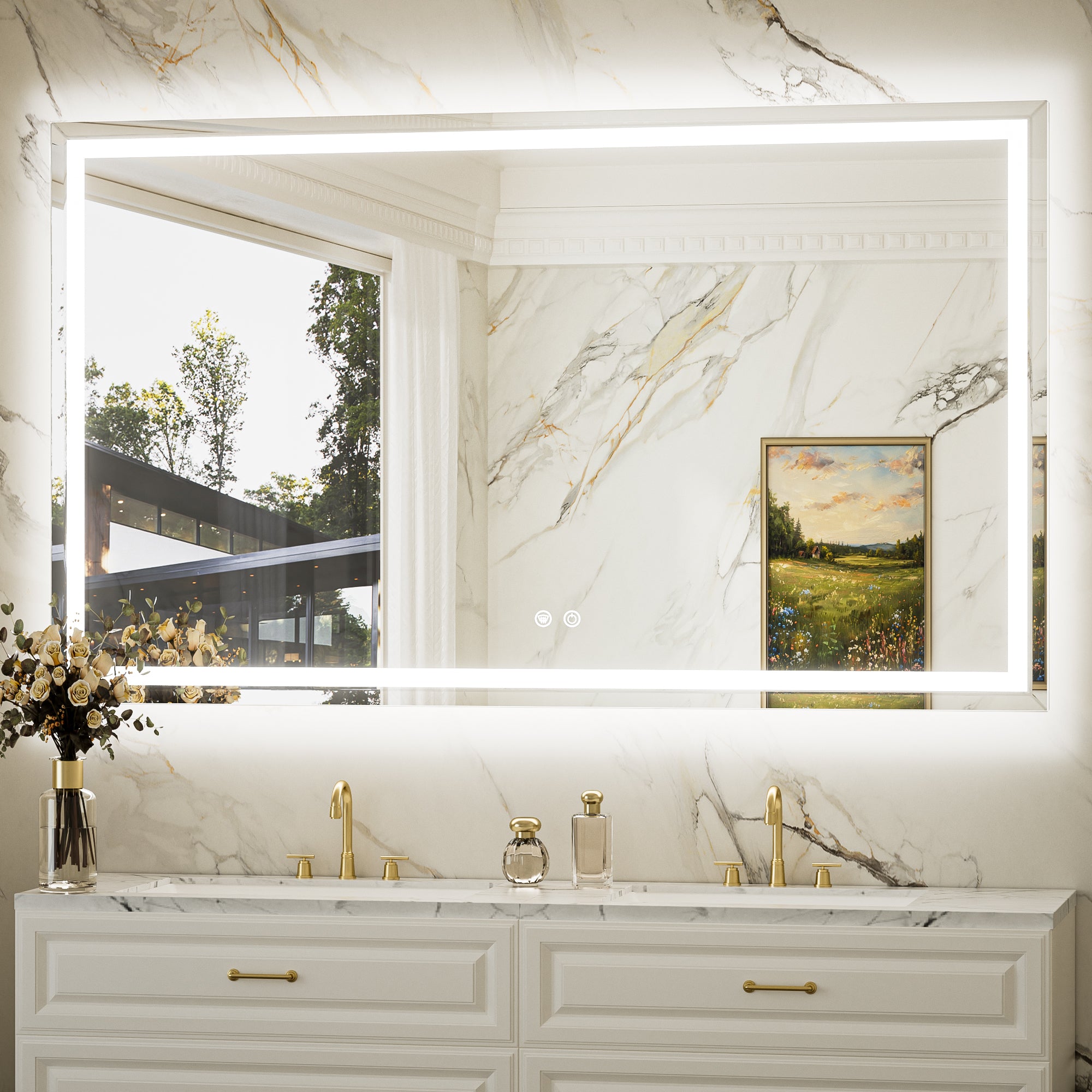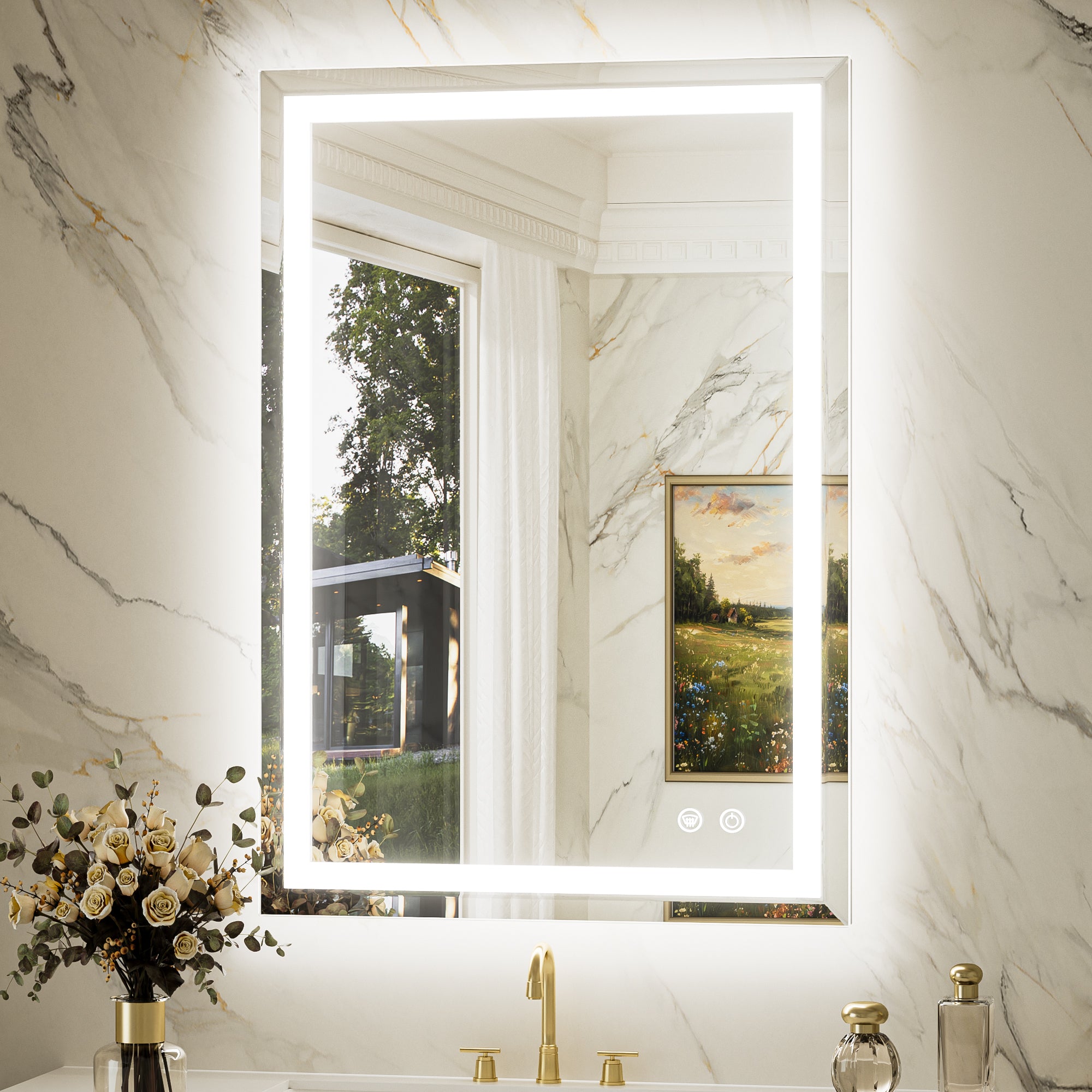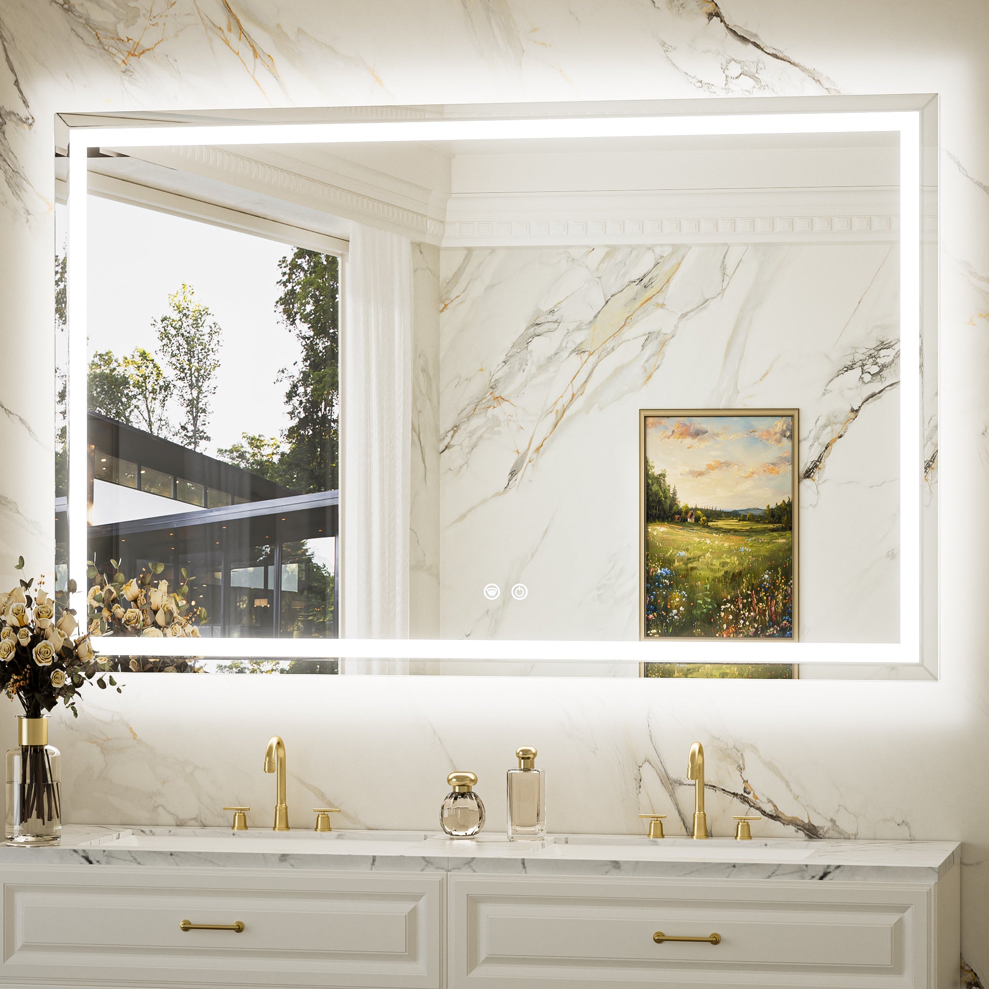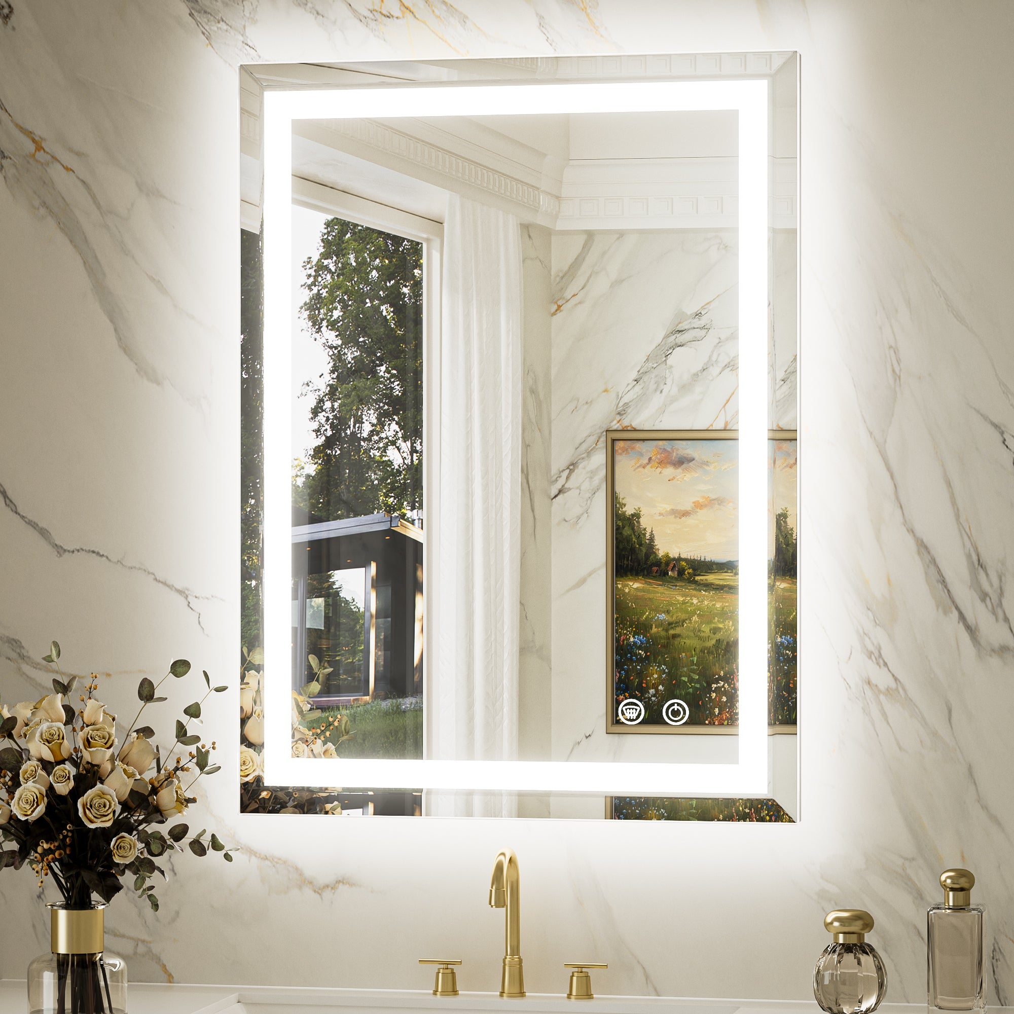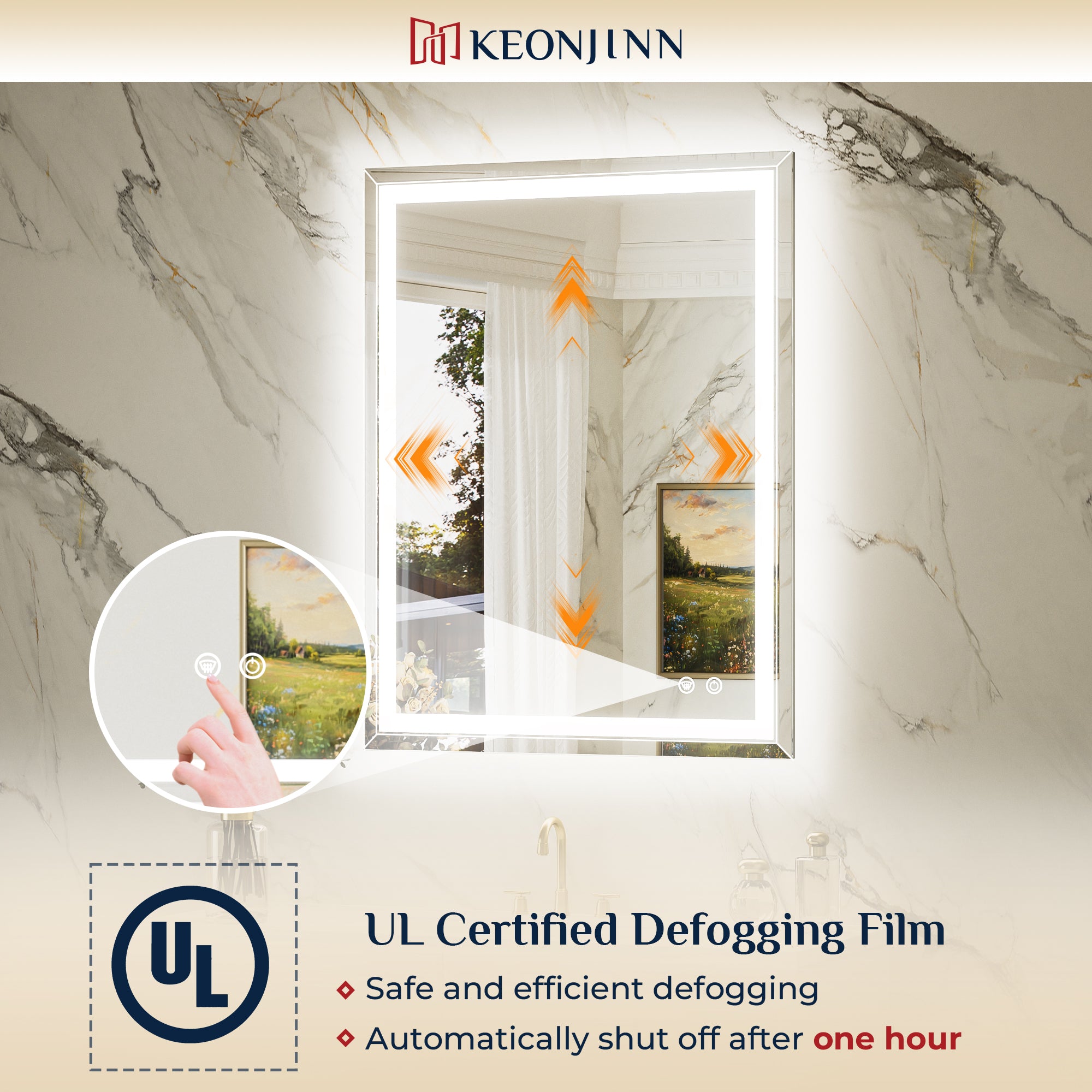 【Safe & Fast Defogging】Upgraded UL listed defogging film for fast heating to clean the whole lighted mirrors for bathroom wall. It automatically shuts off after an hour to prevent overheating, adding extra peace of mind. IP44 waterproof rating ensures safe lighting in wet bathrooms.