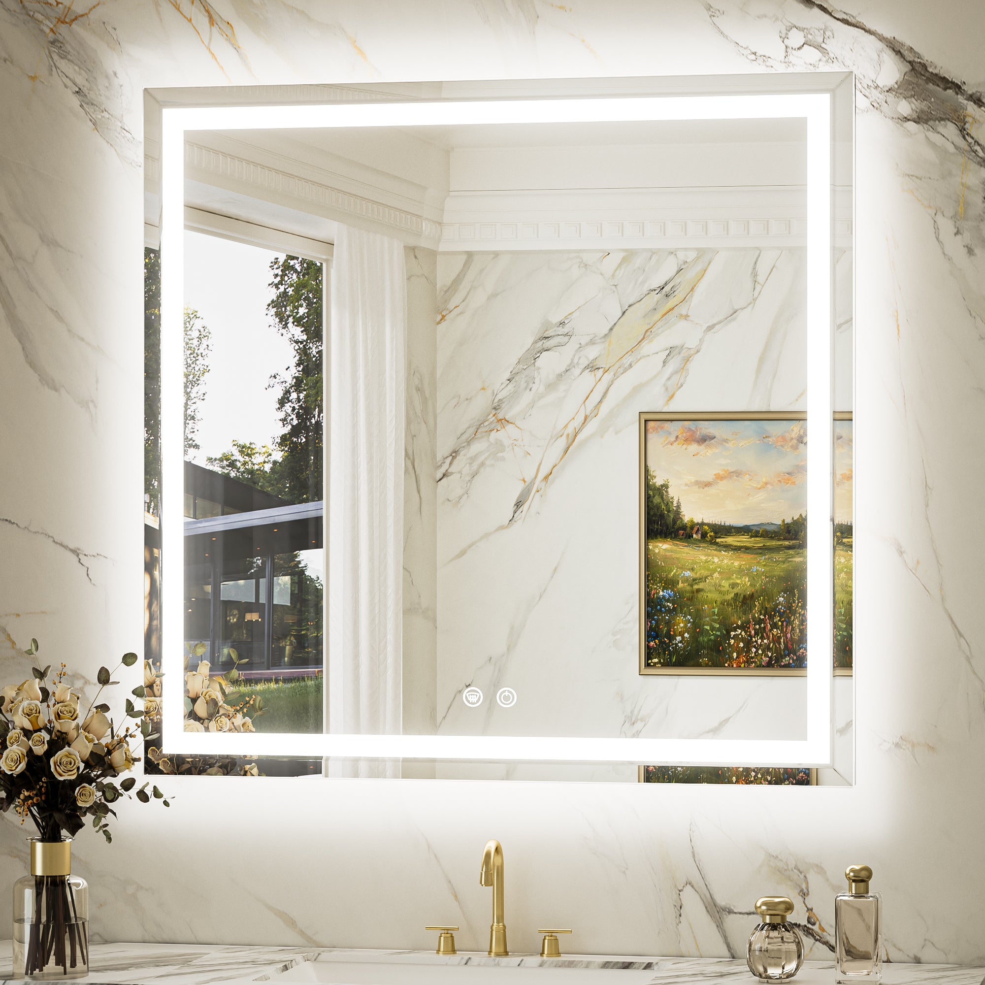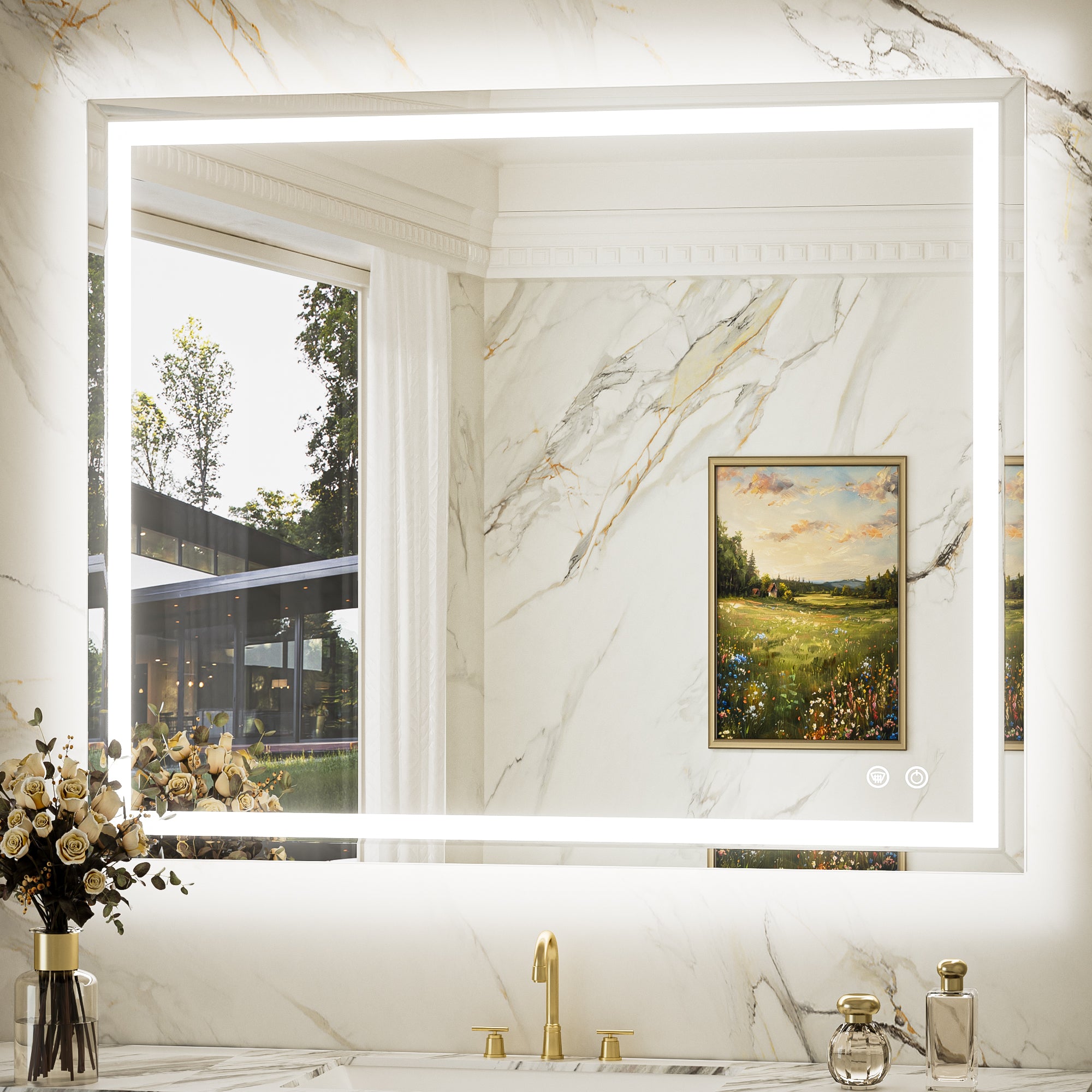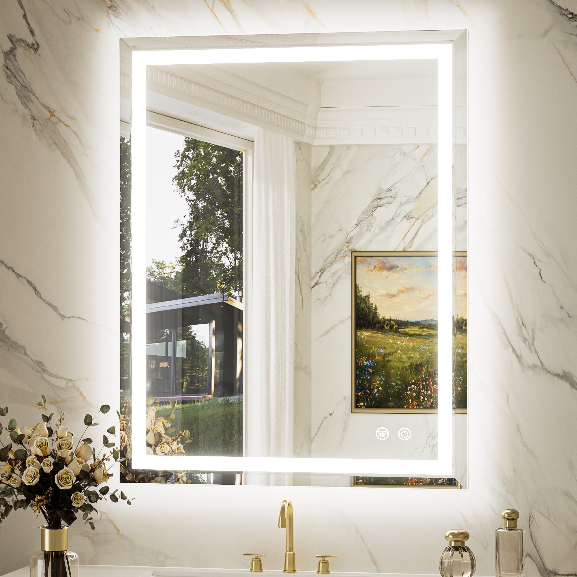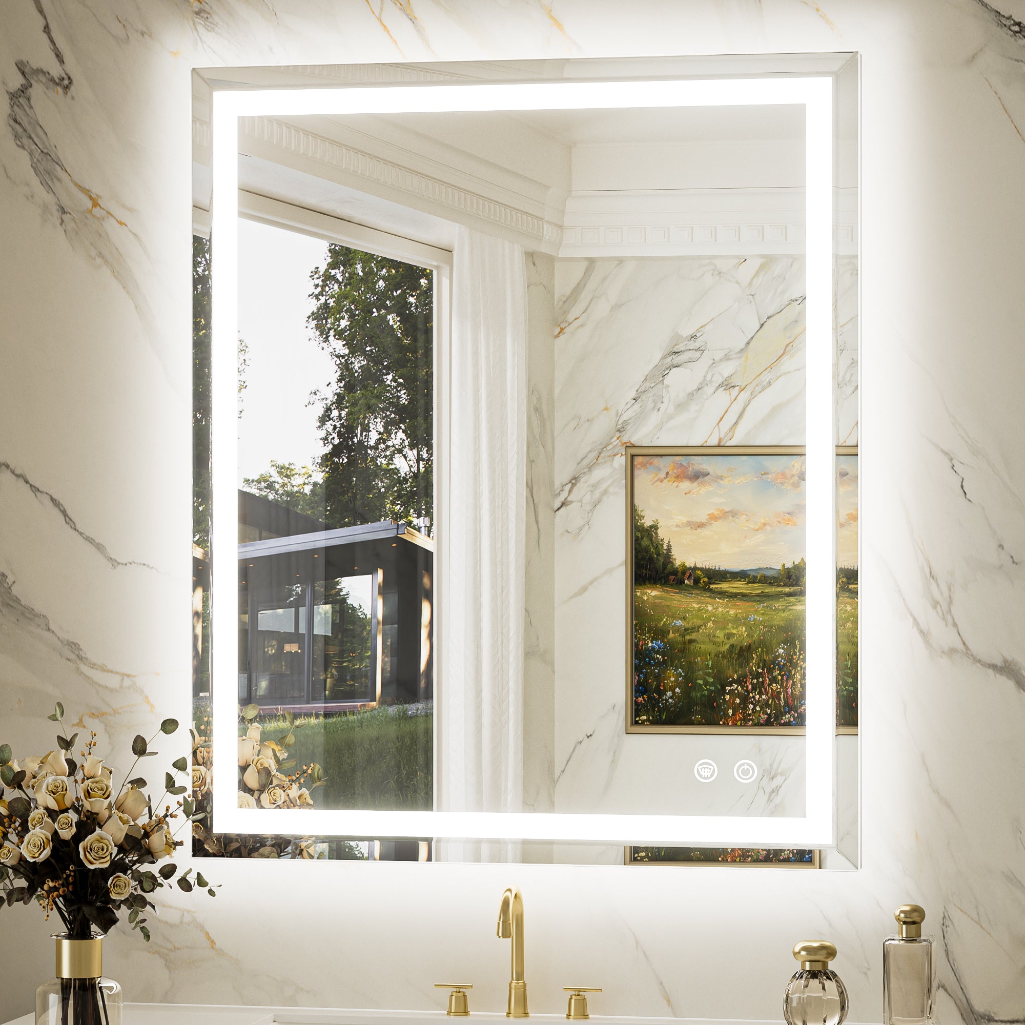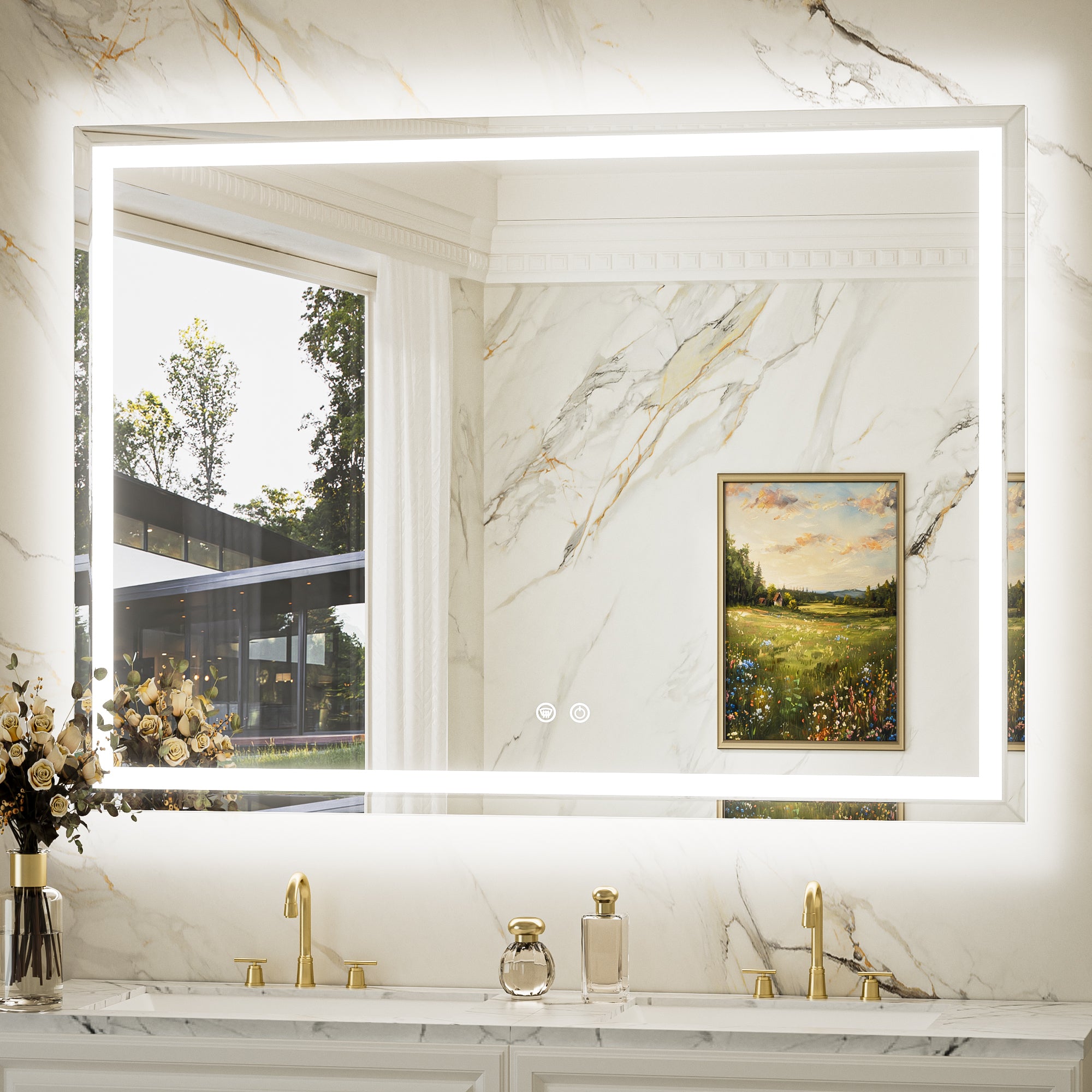 【Safe & Fast Defogging】Upgraded UL listed defogging film for fast heating to clean the whole lighted mirrors for bathroom wall. It automatically shuts off after an hour to prevent overheating, adding extra peace of mind. IP44 waterproof rating ensures safe lighting in wet bathrooms.