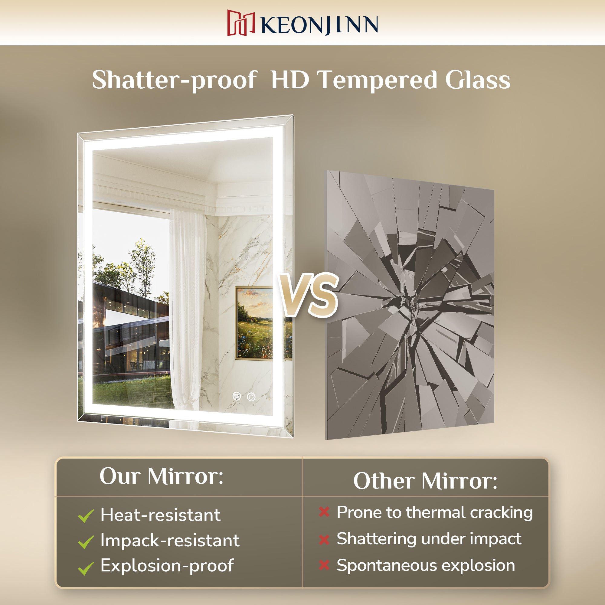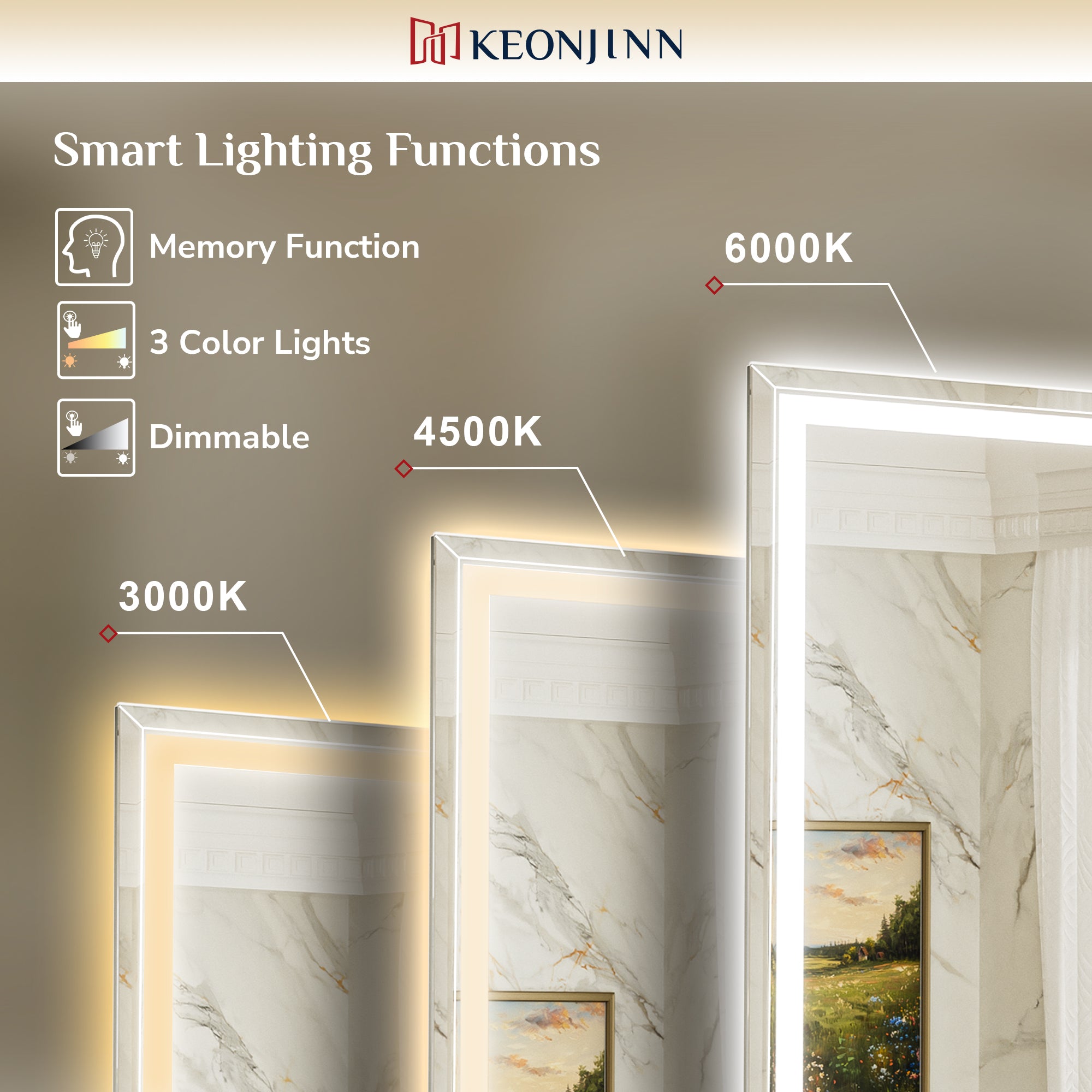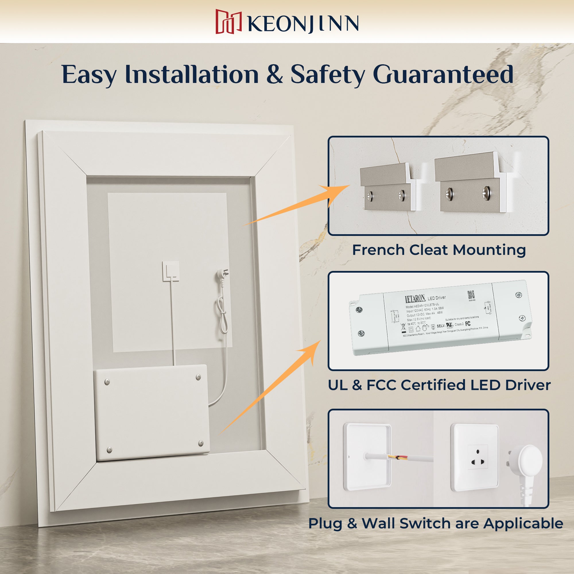 【Effortless Installation & Expert Support】Installing this lighted bathroom mirror is effortless—we include French cleats, all necessary hardware, and even different screws to fit various wall types. It supports both vertical and horizontal mounting, so you can set it up exactly how you want. Need help? As a trusted brand Keonjin in mirror category, our responsive 24/7 customer service team is always here with solutions you can count on.