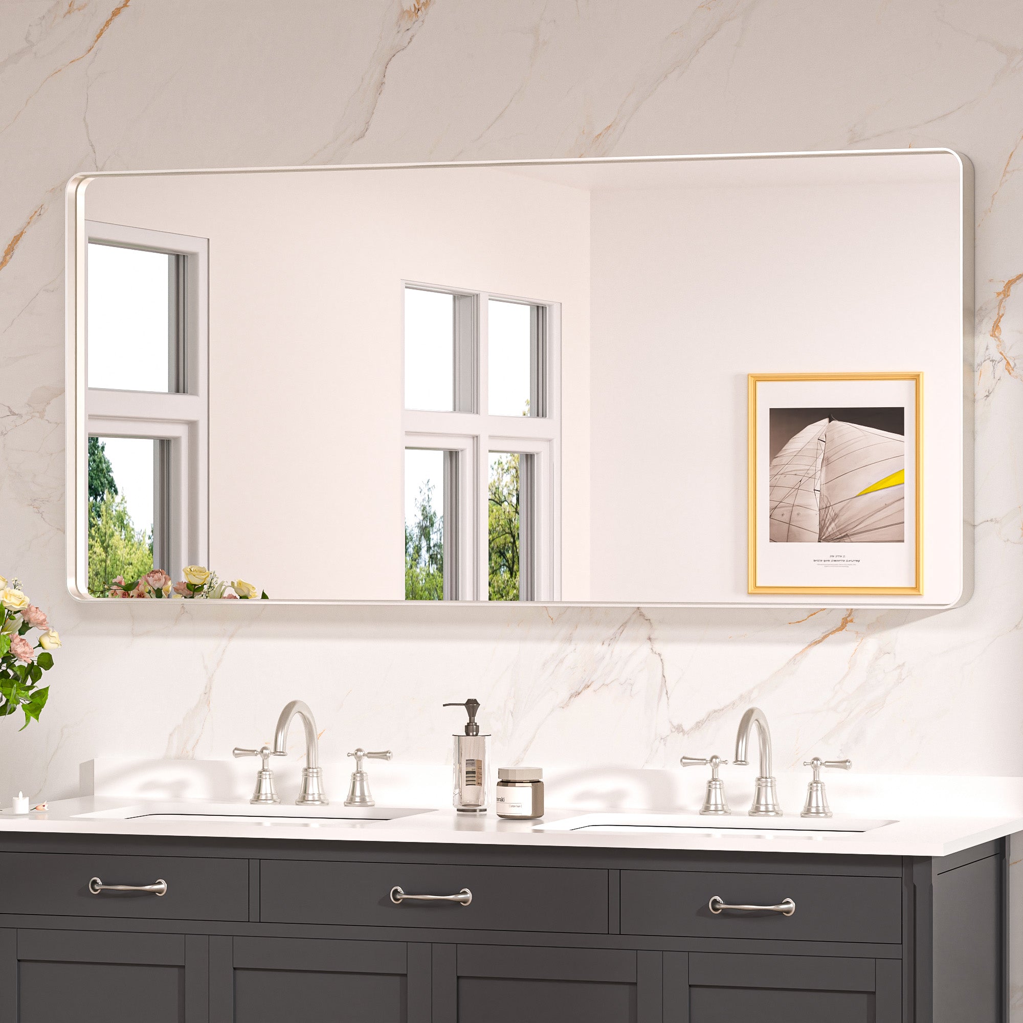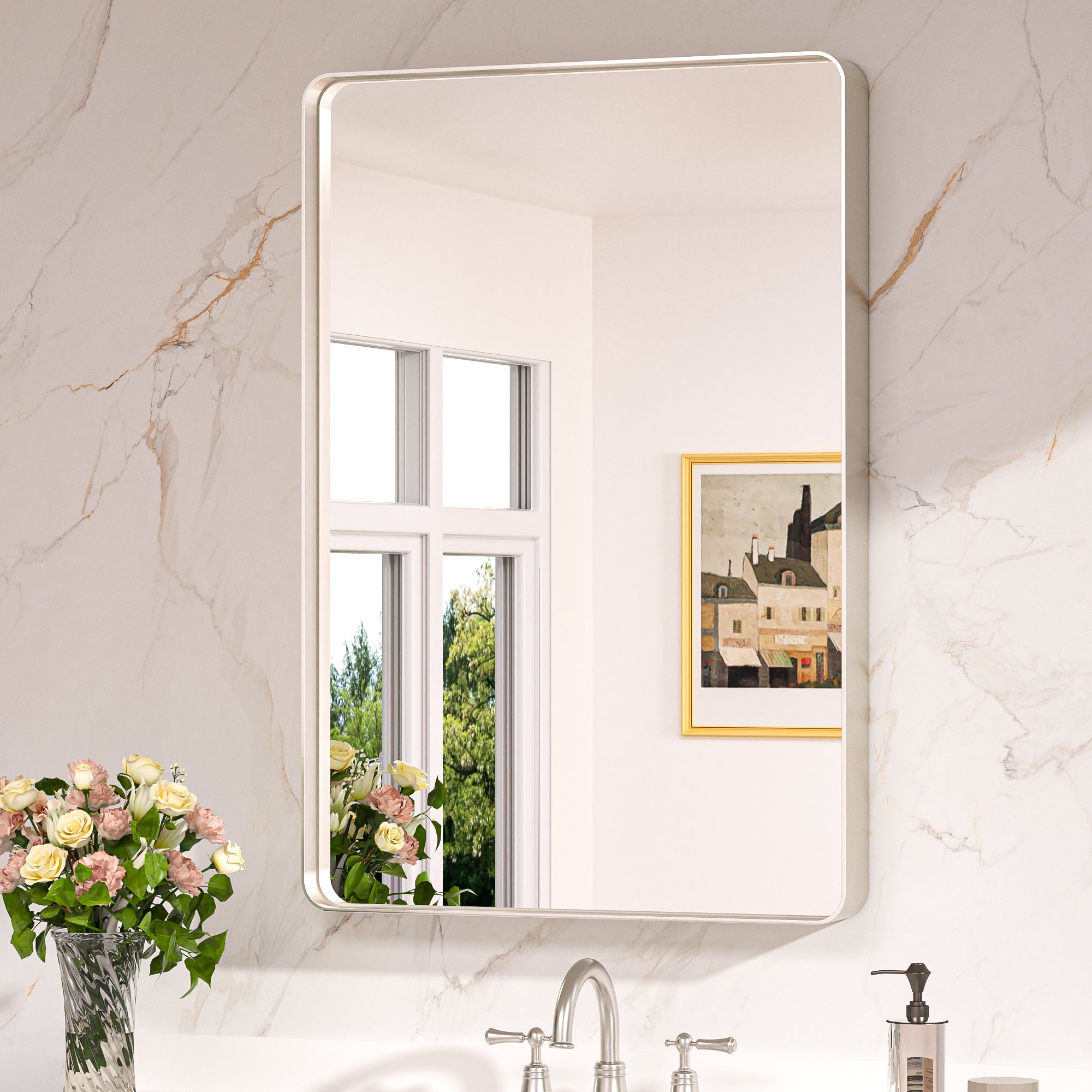 ¡¾Sturdy Frame with Color Options¡¿Crafted with enduring aluminum alloy, this vanity mirror's sturdy frame remains moisture-proof, rust-resistant, and non-deforming over time, providing a reliable addition to your bathroom. Choose from four elegant color options: Matte White and Matte Black, both featuring a fine granular finish; Matte Silver with a smooth matte surface; or Brushed Gold with a sleek, brushed texture. Each color brings its unique charm, to match any d¨¦cor. ? ?