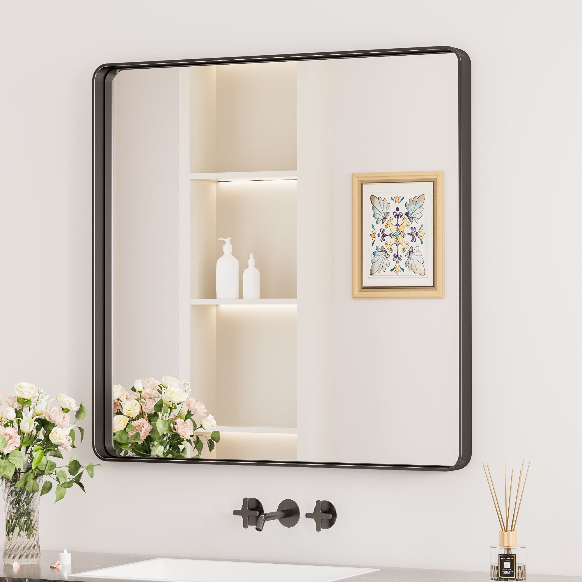 ¡¾Strong Mirror with Shatter-proof Assurance¡¿Experience crystal-clear and distortion-free reflections with our black bathroom mirror's 4mm thick tempered glass. Reinforced with a shatter-proof film, it ensures both safety and durability, allowing you to focus on your daily grooming routine without worry. ? ?